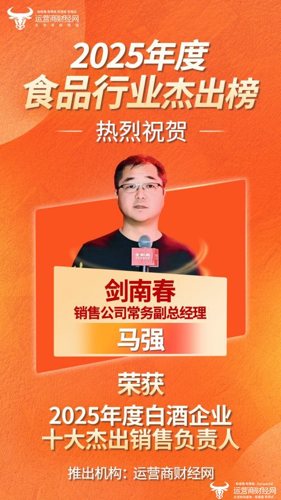 近日,由运营商财经网独家编制的“2025年度白酒企业十大杰出销售负责人”名单正式揭晓,剑南春销售公司常务副总经理马强成功入选!