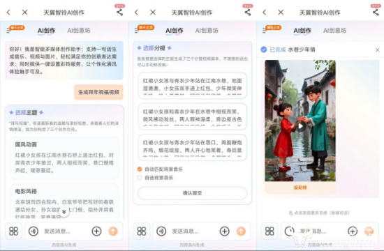 操作难度几乎为零,在APP首页找到AI创作板块,输入“生成拜年祝福视频”的想法,系统就会给出好几种创作风格。我选了爸妈喜欢的国风动画,不到三分钟就生成了带背景音乐的视频,直接设置成彩铃就行。发给爸妈看的时候,他们直接夸有创意、够特别。里面还有科幻、动漫等模板,也很吸睛。