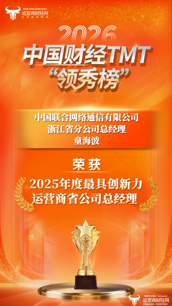 盛典期间,运营商财经网正式公布了年度评选获奖名单。其中,中国联合网络通信有限公司浙江省分公司总经理童海波,斩获“2025年度最具创新力运营商省总经理”。
