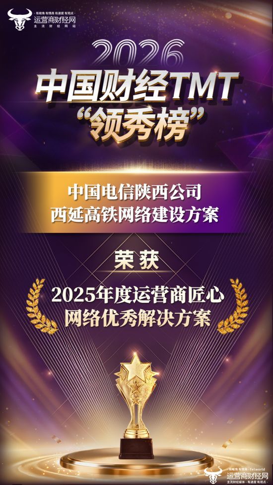 1月29日下午,主办方运营商财经网在2026中国财经TMT“领秀榜”盛典上宣布,陕西电信的西延高铁网络建设方案荣获“2025年度运营商匠心网络优秀解决方案”!