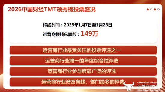 目前,2026中国财经TMT领秀榜评选已是运营商行业最受关注的投票评选之一,运营商行业唯一的年度综合性评选,运营商行业参与度最广泛的评选,运营商行业涉及条线、部门最多的评选。