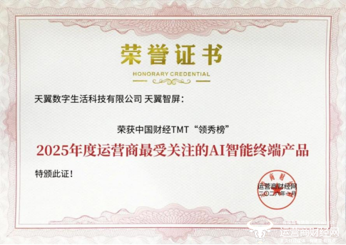 1月29日,在由运营商财经网举办的2026中国财经TMT“领秀榜”盛典中,天翼数字生活公司荣获2025年度优秀运营商专业公司、2025年度运营商最受关注的AI智能终端产品、2025年度智慧家庭市场创新引领企业等多个奖项。