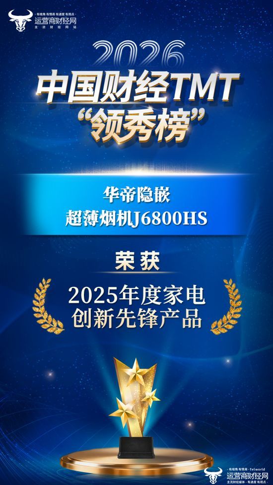 盛典期间,运营商财经网公布了各个奖项的获奖名单。华帝在多个领域表现突出,在“2025年度家电创新先锋产品”奖项中,华帝隐嵌超薄烟机J6800HS凭借出色表现,荣获该奖!