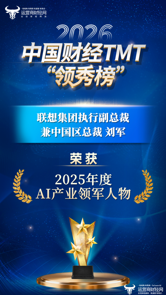 1月29日,在运营商财经网年度行业盛会——2026中国财经TMT“领秀榜”盛典上,联想集团执行副总裁兼中国区总裁刘军获评“2025年度AI产业领军人物”。