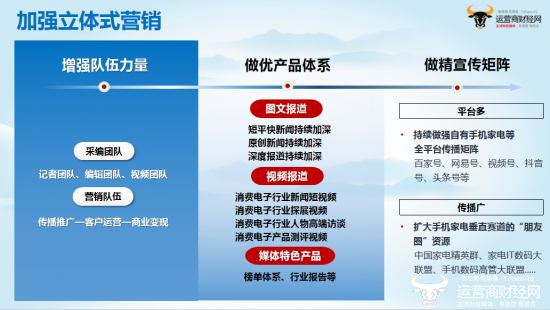 第一要增强队伍力量。完善记者、编辑、视频三大采编团队建设,组建传播推广、客户运营、商业变现的营销队伍,实现跨团队协同,打造高效作战单元。