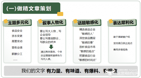 第一,做精文章策划。运营商财经网围绕食品安全、资本变动、高管更迭、业绩风云等多元主题,坚持“叙事人物化、话题敏感化、表达犀利化”。既写大佬也写普通人,挖内幕也亮观点,敢于捅破窗户纸,让文字有力量、有味道、有棱角。