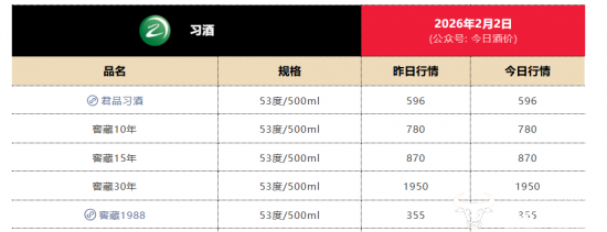 此外,有市场消息称,君品习酒今年整体将进行减量,2026年全国限量4000吨,而这可能与其酒下跌有关。君品习酒在2021年批发价曾高达955元/瓶,而据今日酒价数据,君品习酒2月2日批发价为596元/瓶,已跌至600元以下,跌幅超三成。
