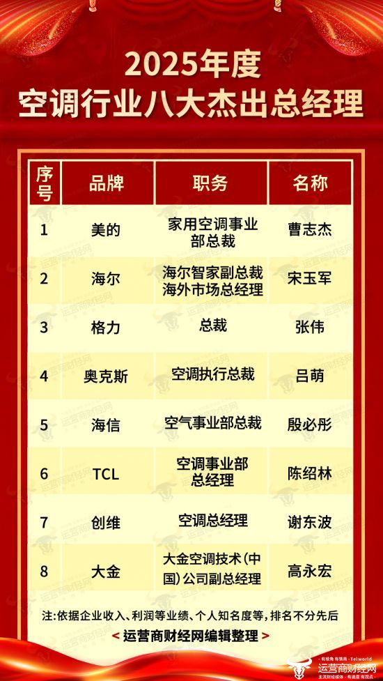 日前,运营商财经网基于对空调行业整体的观察,推出了“2025年度空调行业八大杰出总经理”榜单,旨在对过去一年行业表现优秀的企业及个人进行表彰。现今,具体的上榜名单已经确定。