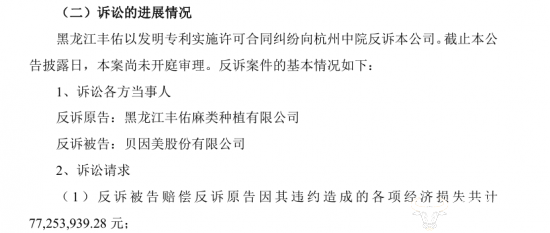 公告显示,因专利合同纠纷,贝因美于2025年12月向法院起诉了黑龙江丰佑麻类种植有限公司,诉求金额约为5685.24万元,但黑龙江丰佑却在近期提出了反诉,指控贝因美根本性违约,并提出了高达7725.39万元的赔偿金额,至此双方争议的总金额已达约1.34亿元。