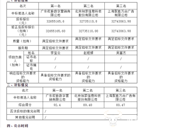 北京知家信息科技股份有限公司以3273.51万元(32735110.8元)报价排在第二中标候选人之位;上海聚胜万合广告有限公司以3274.31万元(32743063.98元)报价排在第三中标候选人之位,两家公司无缘该项目。