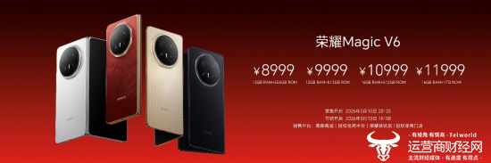 荣耀Magic V6共提供12GB+256GB、12GB+512GB、16GB+512GB、16GB+1TB四个版本,售价8999元起。新品已即刻开启预售,并将于3月13日上午10:08,在荣耀商城、各大授权电商平台、荣耀体验店、授权零售门店正式开售。