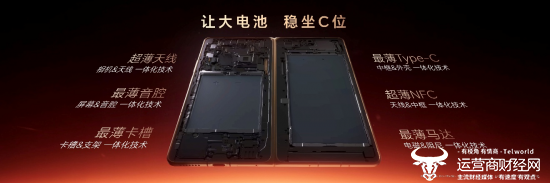 在内部设计方面,为了在极限空间里给电池留下足够空间, 荣耀Magic V6针对内部空间做了系统性考量,对天线、音腔、卡槽、Type-C、NFC、马达等组件进行极致轻薄化处理,让电池稳坐C位。