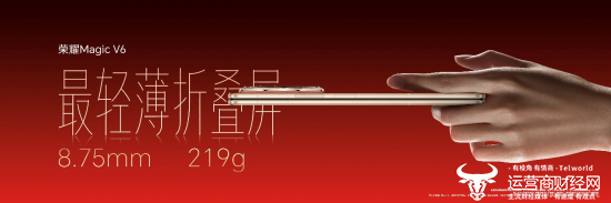 自荣耀Magic V2引领折叠屏进入“毫米时代”以来,轻薄就成为了荣耀折叠的基因。此次荣耀Magic V6折叠形态下薄至8.75毫米,轻至219g,展开状态下的厚度只有4.0毫米,依旧是“最轻薄折叠屏”代名词。