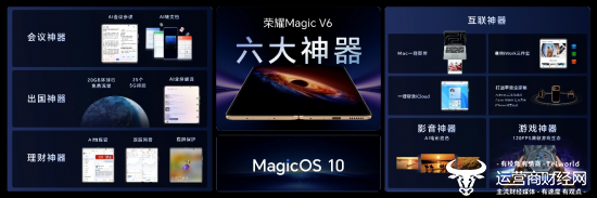 如果说硬件实力决定折叠屏的性能边界,那么AI和生态等软件能力则决定折叠屏的好用程度。此次荣耀Magic V6不仅在硬件创新上实现“全满贯”,在软件配置上也同样能打。荣耀Magic V6带来会议、理财、出国、影音、游戏、互联六大场景的“六大神器”软件体验。