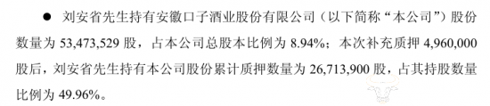 公告显示,口子窖实际控制人、联合创始人刘安省在2023年及2024年质押三笔公司股份并多次展期后,于2026年2月再次补充质押公司股份496万股,累计持有公司股份质押数量为2671.39万股,占其持股数量的49.96%,将近一半。