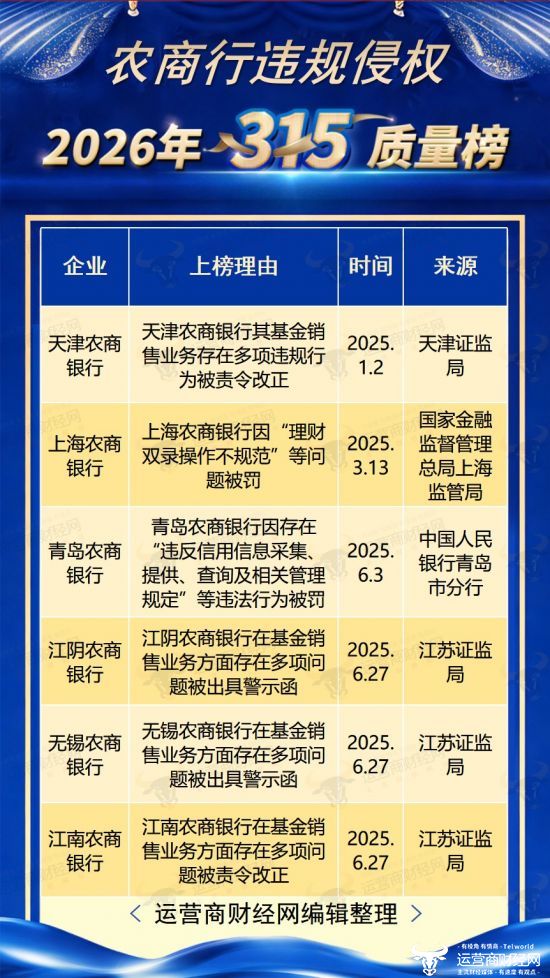 随着2026年315临近,运营商财经网“农商行违规侵权315榜”正式推出,揭秘过去一年该行业头部企业存在侵犯消费者权益的问题。
