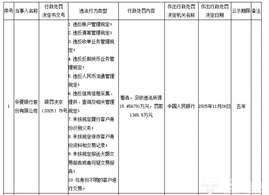 行政处罚信息显示,2025年11月26日,华夏银行因“违反信用信息采集、提供、查询及相关管理规定,未按规定履行客户身份识别义务,未按规定保存客户身份资料和交易记录”等多项违法事实,被中国人民银行警告,没收违法所得15.456791万元,并罚款1365.5万元。