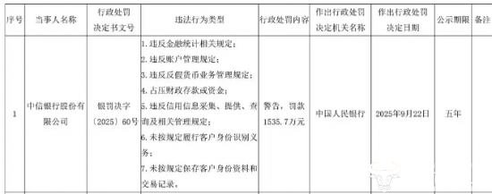 公开处罚显示,2025年9月22日,中信银行因存在“违反信用信息采集、提供、查询及相关管理规定;未按规定履行客户身份识别义务;未按规定保存客户身份资料和交易记录”等多项违法事实,被中国人民银行警告,并罚款1535.7万元。