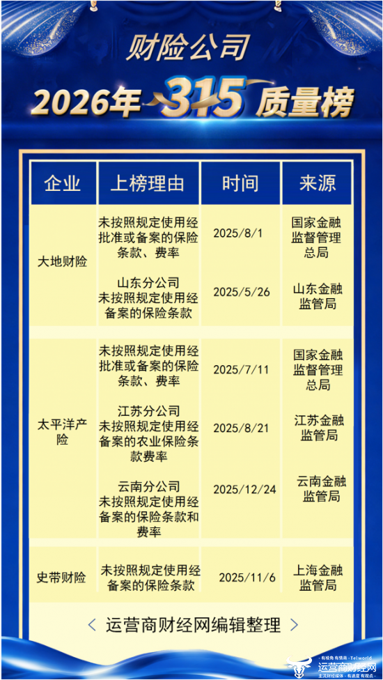 日前,运营商财经网梳理了过往一年财险公司侵犯消费者权益的案例,来源均出自官方权威机构,整理推出了“运营商财经网2026年315财险公司侵犯消费者知情权和决策权榜”。恰逢3·15国际消费者权益日,也为消费者梳理了一份榜单。