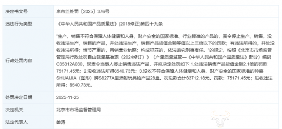 因此,北京市市场监督管理局于2025年11月25日对其做出以下处罚,一是处以违法销售产品货值金额2.1倍的罚款75171.45元;二是没收违法所得8540.73元;三是没收相关不合格产品28盒。合计罚没款项超8.37万元。