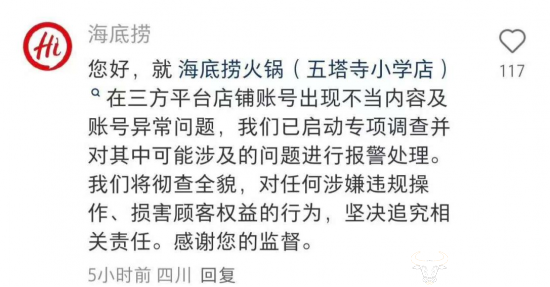 随后涉事门店经理表示,门店的账号被非法登录,但该解释并不能使网友信服。8月25日,海底捞官方在当事人评论区回复称,针对平台店铺账号出现不当内容及账号异常问题,已启动专项调查并对其中可能涉及到的问题进行报警处理。