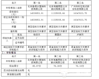 具体来看,两家来自北京的公司位居第一、第二名。排在第一名的鱼得水投标报价为14539053.91元;排在第二名的海嘉明哲投标报价最低,为11335935.66元。