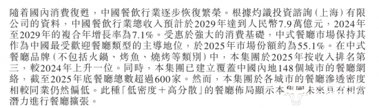 值得注意的是,绿茶集团在财报中提到,“在中式餐厅品牌(不包括火锅、烤鱼、烧烤等类别)中,本集团于2025年按收入排名第三,较2024年上升一位”,不知这个数据是否具有权威性。