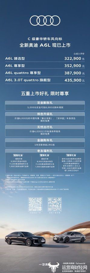 3月25日,一汽奥迪时代精英盛典暨全新奥迪A6L家族上市发布会在北京举行。活动现场,全新奥迪A6L上市,全系推出臻选型、尊享型、quattro尊享型、3.0T quattro旗舰型共4款配置车型,心动入手价分别为32.29万元、35.29万元、38.79万元、43.59万元。