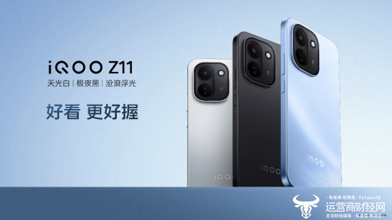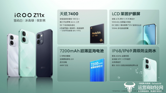 iQOO Z11x 同场亮相,主打 LCD 长续航护眼,具备“冰青绿”、“雪屿白”和“夜影黑”三款配色,采用大 R 角设计,外观优雅,握持舒适。