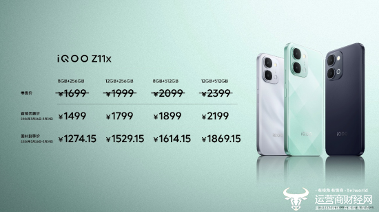 iQOO Z11x 共有 4 个版本可供选择,,8GB+256GB 版本首销优惠价 1499 元(零售价 1699 元,国补到手价 1274.15 元)、12GB+256GB 版本首销优惠价 1799 元(零售价 1999 元,国补到手价 1529.15 元)、8GB+512GB 版本首销优惠价 1899 元(零售价 2099 元,国补到手价 1614.15 元)、12GB+512GB 版本首销优惠价 2199 元(零售价 2399 元,国补到手价 1869.15 元)。