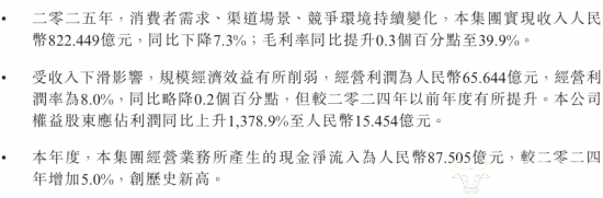 蒙牛发布的2025年业绩报告显示,公司2025年全年实现收入822.4亿元,同比下降7.3%,经营利润由上年同期的72.57亿元下降至65.6亿元,但归母净利润却同比大幅增长1378.9%至15.45亿元。