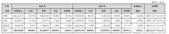 其中,核心主营奶酪业务全年实现收入46.15亿元,同比增长22.84%,营收占比也由上年的80.12%增长至82.37%,但毛利率同比下降1.23个百分点至33.81%。