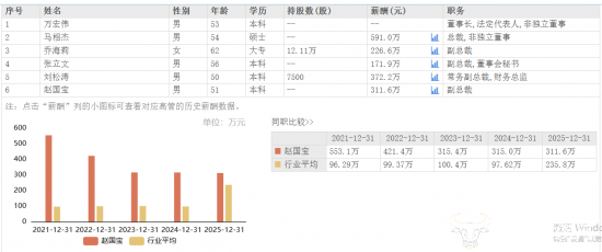 2021年至2025年,赵国宝薪酬分别为553.1万元、421.4万元、315.4万元、315.0万元、311.6万元,可以看出赵国宝薪酬已连续五年保持下降。综合来看,五年的时间里他的薪酬减少了241.5万元,也是公司高管中唯一一个连续五年薪酬下降的,不知他为何会连年降薪。