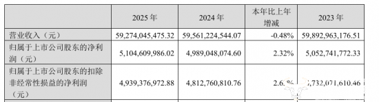 双汇发展发布的2025年年报显示,报告期内,公司实现营业收入592.74亿元,同比微降0.48%,营收规模已连续五年呈现下滑态势,而归母净利润却同比增长2.32%至51.05亿元,呈现增利不增收的情形。
