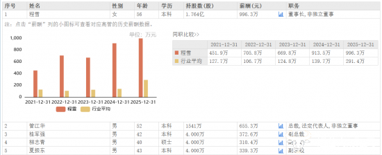 为啥要这么分红呢?公司的高管有不少股票,也能获得分红。天眼查显示,截至2025年年末,董事长程雪持有公司1.76亿股股份,这也意味着,她还可获得年度分红约1.41亿元,远高于她2025年的薪酬。