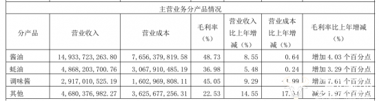 其中,调味品主营业务收入为273.99亿元,同比增长9.04%,而酱油产品收入同比增长8.55%至149.34亿元,“海天酱油产销量和市场占有率已连续数十年位居全国第一”。同时,蚝油产品实现收入48.68亿元,同比上涨5.48%,“市场占有率连续10年位居全国第一”。