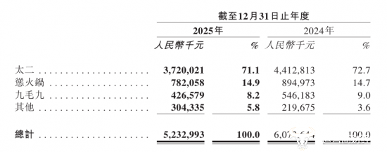 而九毛九旗下三大品牌2025年收入均有所减少。其中,主力品牌太二的门店数量从2024年的634间下降至499间,实现收入37.20亿元,相较于2024年的44.13亿元,减少了15.7%,翻台率下降至3.1次/天。