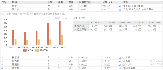 在业绩创新高的情况下,公司高管薪酬也普遍上涨。其中,公司总裁管江华2025年薪酬为655.3万元,相较于2024年的603.3万元,增长了52万元,为其近五年薪酬的最高水平,在公司高管中仅次于董事长程雪的996.3万元。