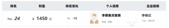 作为百年家族企业,李锦记家族可以说打破了“富不过三代”魔咒,在2025年10月发布的胡润百富榜中,李锦记拥有者李蔡美灵家族以1450亿元的财富排在榜单第24位。