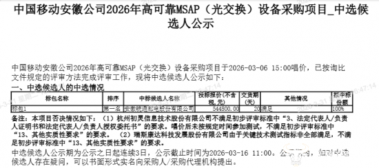日前,中国移动采购网发布了安徽移动“2026年高可靠MSAP(光交换)设备采购项目”中标结果,业内知名厂商竟然因未过初审惨遭否决,这是怎么回事?