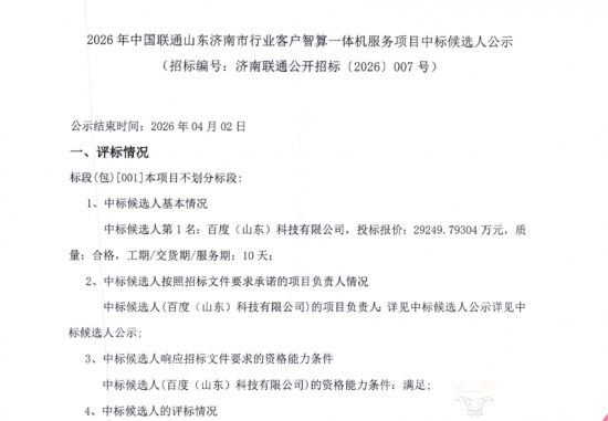 经过一系列严格评选,最终只有百度(山东)科技有限公司成为项目唯一的中标候选人,投标报价29249.79304万元,只比预算金额低了73.20696万元,在近3亿的项目体量中,这一价差不算很大。