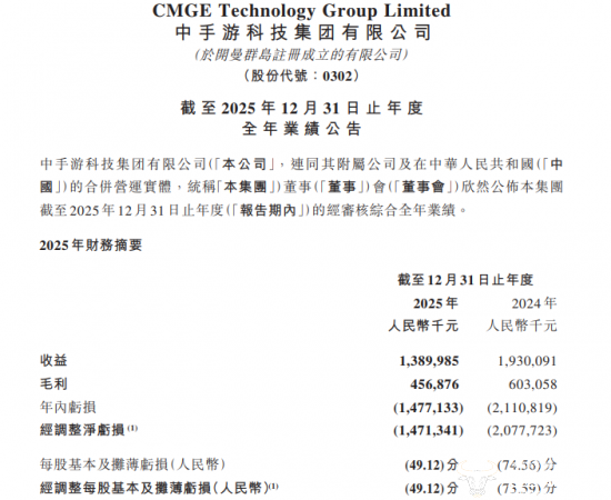中手游在2025年实现营收约为13.90亿元,与上年同期的19.30亿元相比有所下降;年内亏损约为14.77亿元,与上年的21.11亿元相比有所收窄,但仍处于亏损状态。