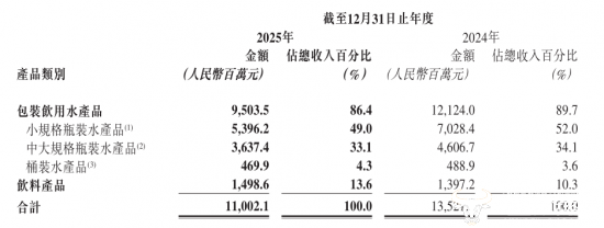 据两家企业发布的业绩报告,华润饮料2025年实现营业收入110.02亿元,同比减少18.6%;农夫山泉全年实现营收525.53亿元,同比增长22.5%,首次突破500亿大关,约是华润饮料的5倍。