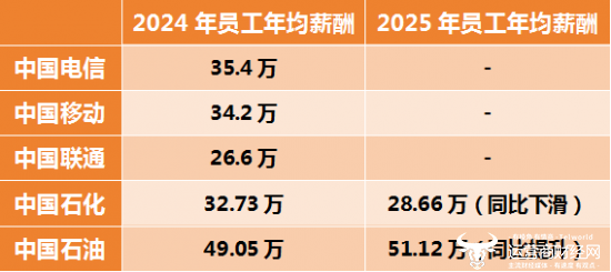 以三大运营商的员工平均年薪与中国石化作为举例对比。