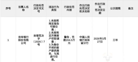 具体来看,吉林银行因未按照规定报告可疑交易、未按规定开展客户尽职调查、为身份不明的客户提供服务并与其交易等多项违规行为,被中国人民银行吉林省分行警告并处罚款204.5万元。此次处罚的核心,直指该行在反洗钱领域的严重合规缺陷。