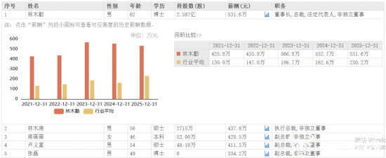 其中,董事长林木勤2025年薪酬由2024年同期的552.7万元下调至531.6万元,减少了21.1万元,但仍为公司高管中的最高薪酬。而他的弟弟、公司执行总裁林木港2025年薪酬为437.8万元,相较于2024年的496.1万元,下降了58.3万元,薪酬在公司高管中仅次于林木勤。