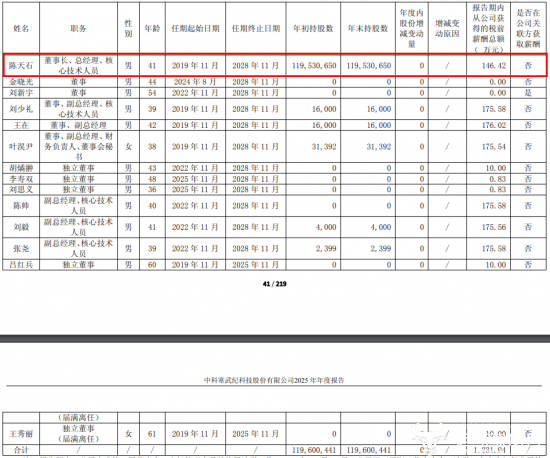 不过,陈天石虽然拿着最低的年薪,但他手中持有的巨额股权。截至2025年末,陈天石持有寒武纪1.195亿股。即便只考虑2025年度每股15元的现金分红方案,他的分红收入就高达约1.79亿元,远超年薪数十倍。