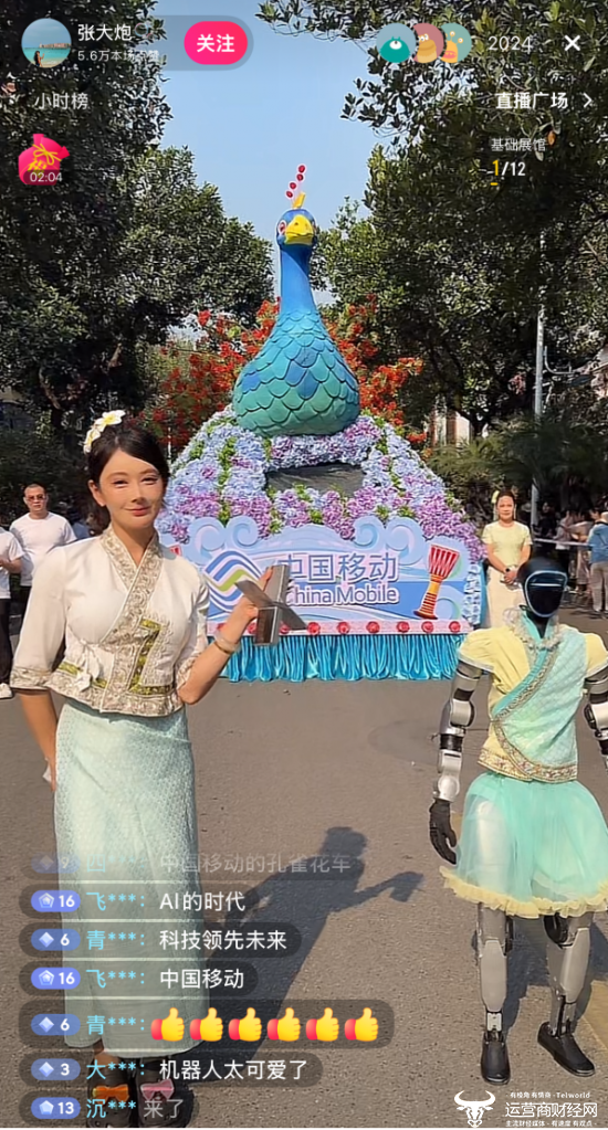 要说泼水节最具视觉冲击力的环节,非民族民间文化大游演莫属。傣族、布朗族、哈尼族等各民族方队盛装起舞,尽显版纳多民族风情。一辆辆花车紧随其后缓缓穿行,沿街播撒祝福。其中,中国移动云南公司(以下简称:云南移动)孔雀花车格外亮眼,蓝孔雀傲立车头,凤凰花树热烈盛放, IP形象“豹豹”惬意窝在花荫下,车前三台机器人随鼓点起舞,吸引了不少人打卡拍照。