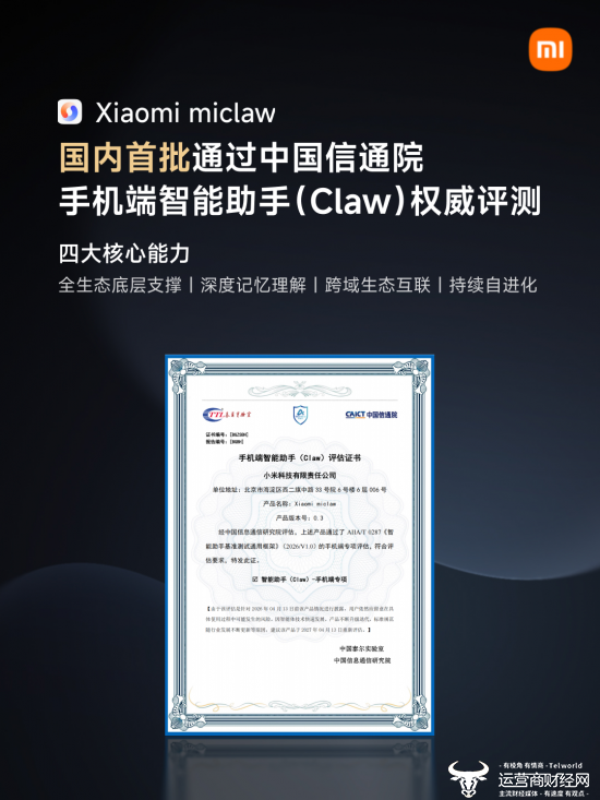 近日,中国信息通信研究院(以下简称“中国信通院”)开启手机端智能助手(Claw)的评估,Xiaomi miclaw 成为国内首批通过该权威评测的手机端智能体。这标志着小米在智能助手领域的技术实力与产品体验获得权威认可,也彰显了小米在“人车家全生态”AI落地领域的前瞻性布局。