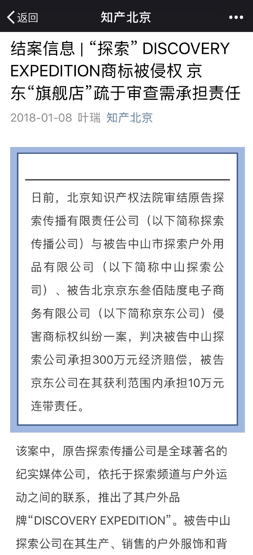 2017年7月,北京知识产权法院下达了判决。北京知产法院官方微信最新公布的该案判决书显示,被告中山市探索户外用品有限公司(以下简称中山探索公司)、被告京东公司侵害商标权纠纷一案成立,判决被告中山公司承担300万元经济赔偿,被告京东公司承担10万元连带责任。